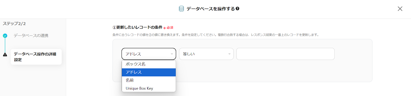 左のボックスをプルダウンからアドレスにしましょう。次に、右のボックスをクリックします。