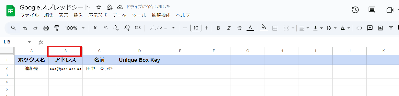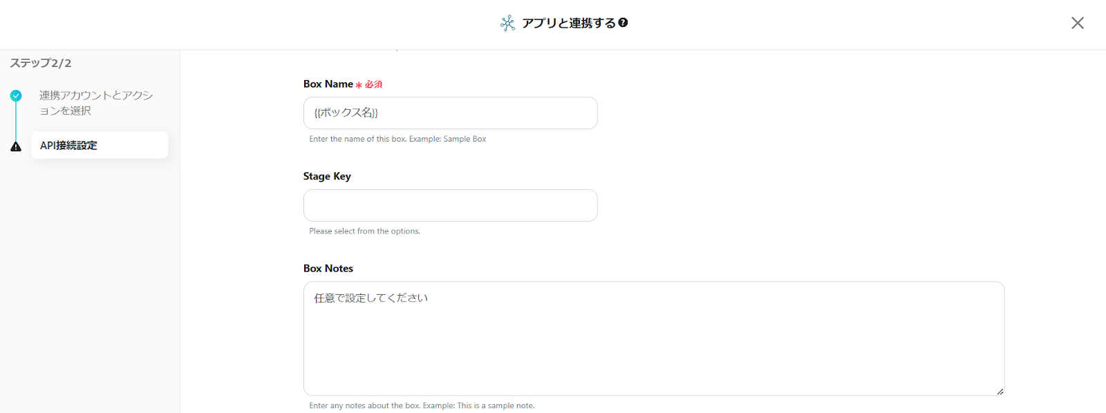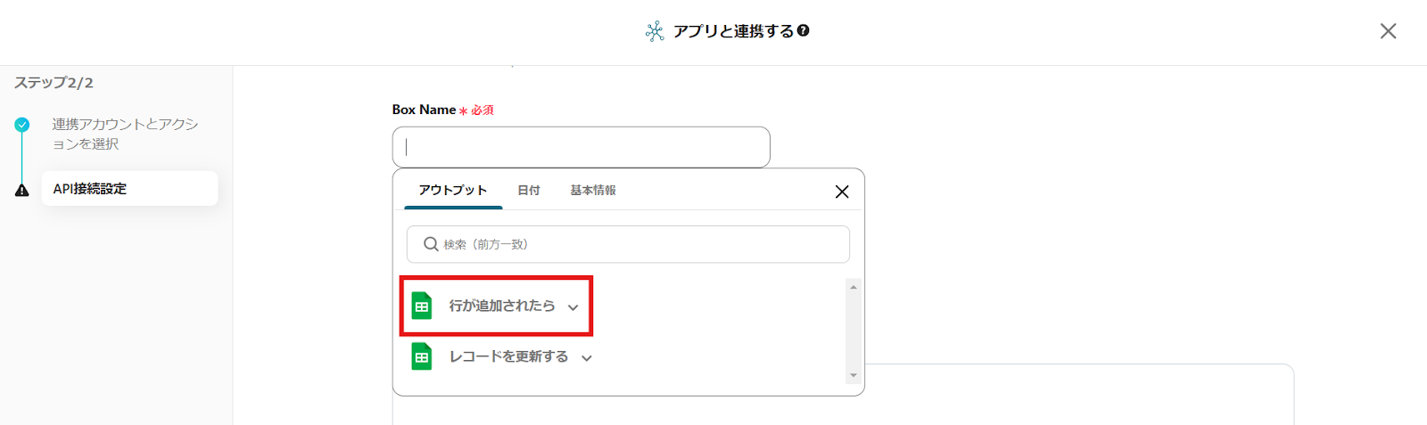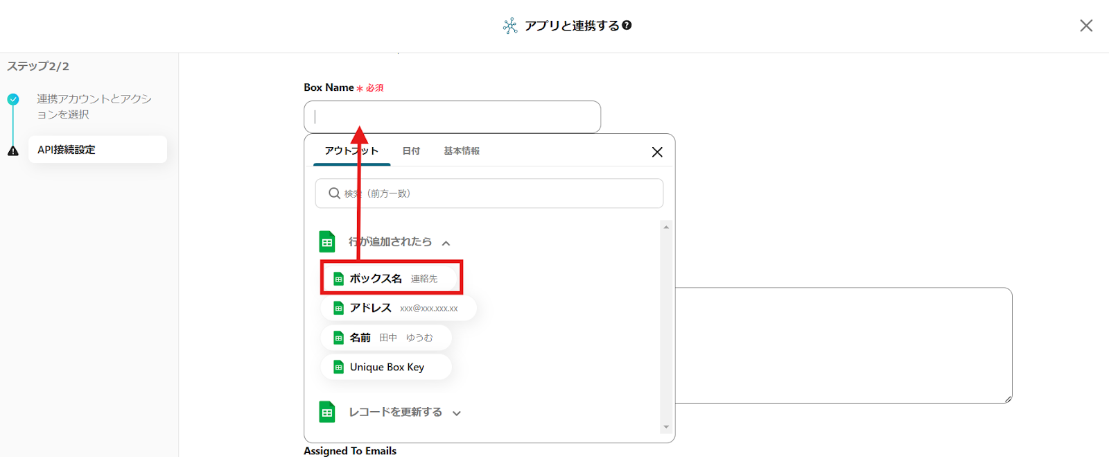 Box NameはGoogle スプレッドシートに登録済みのデータを流用します。