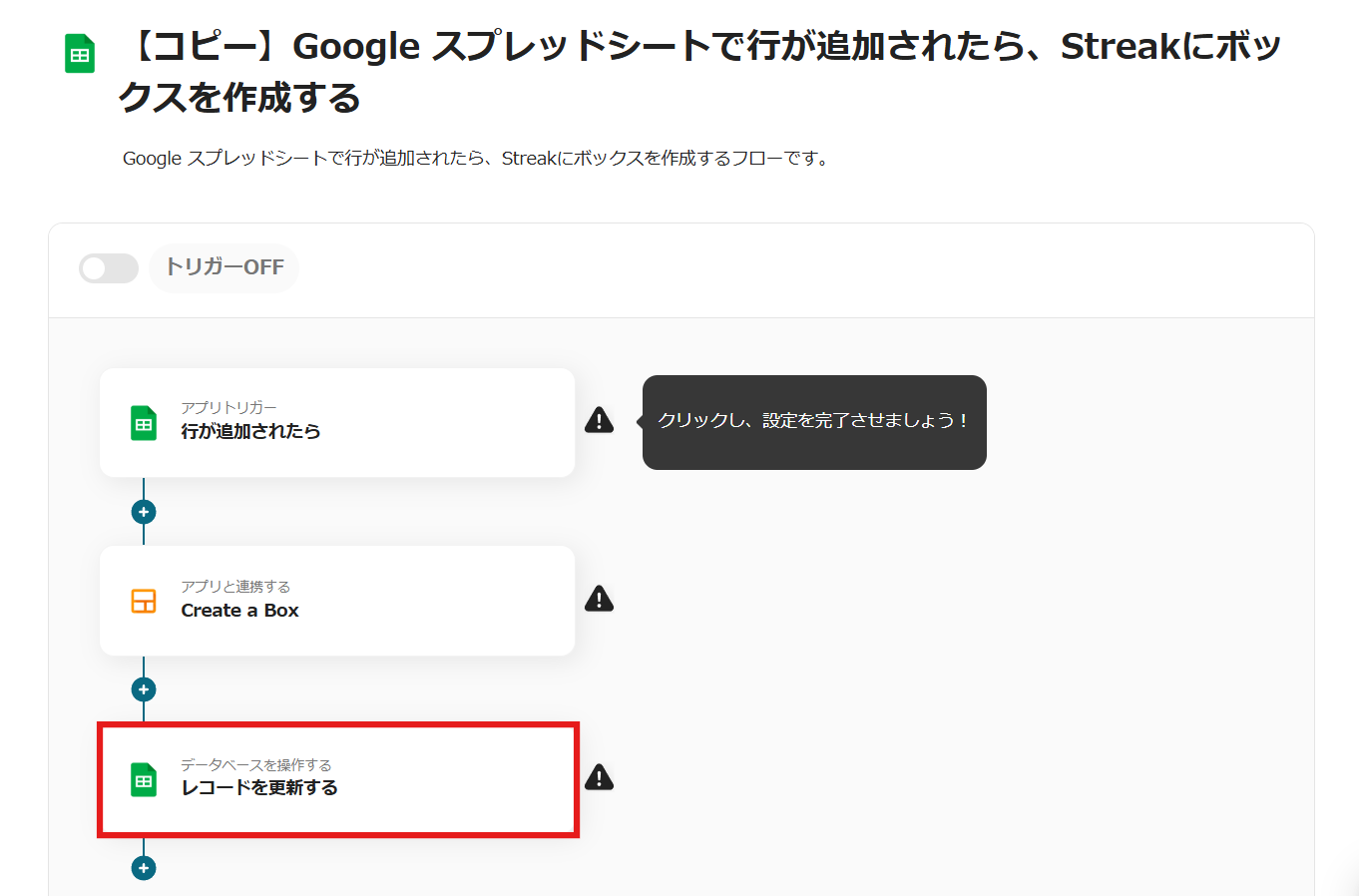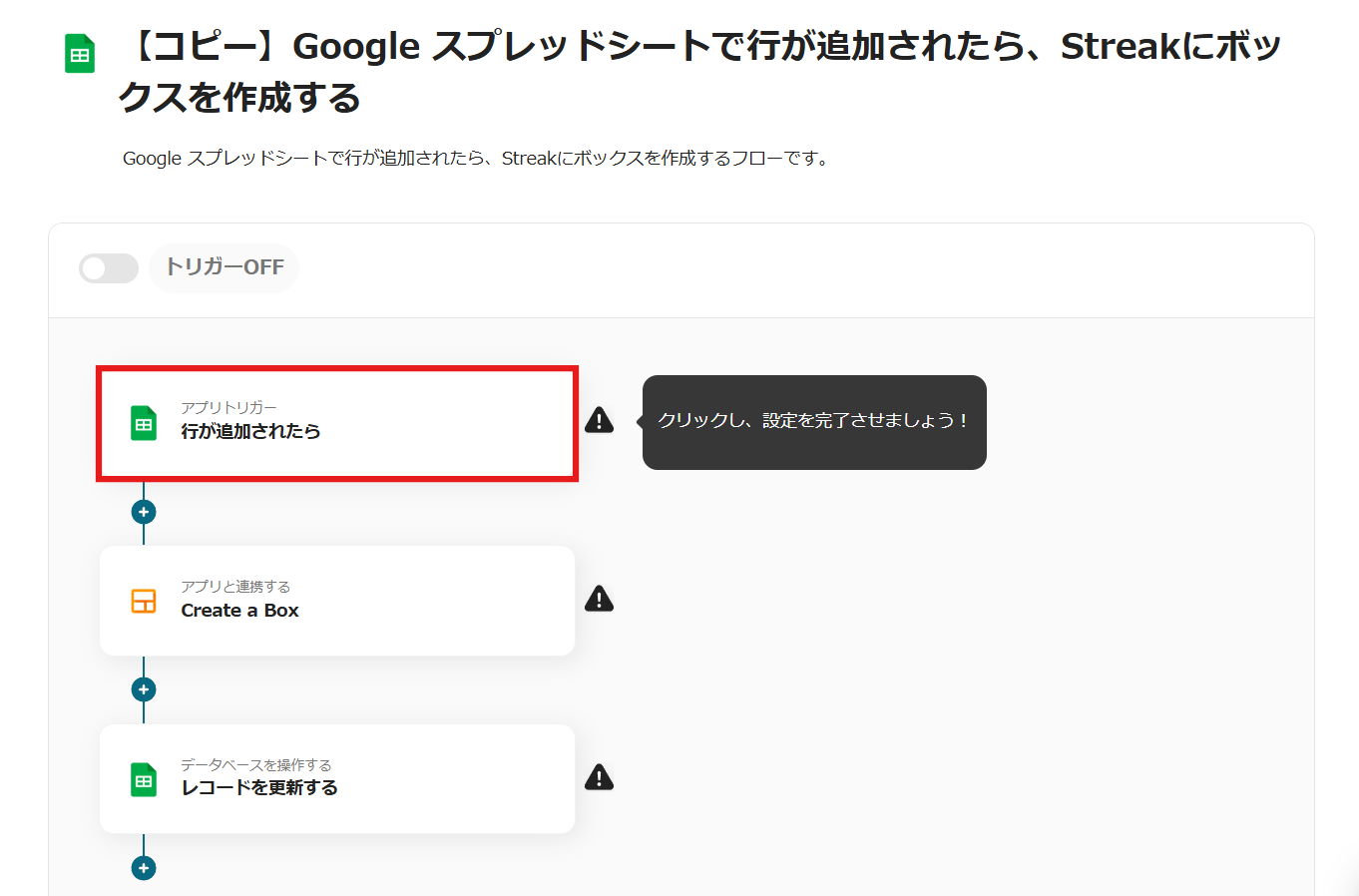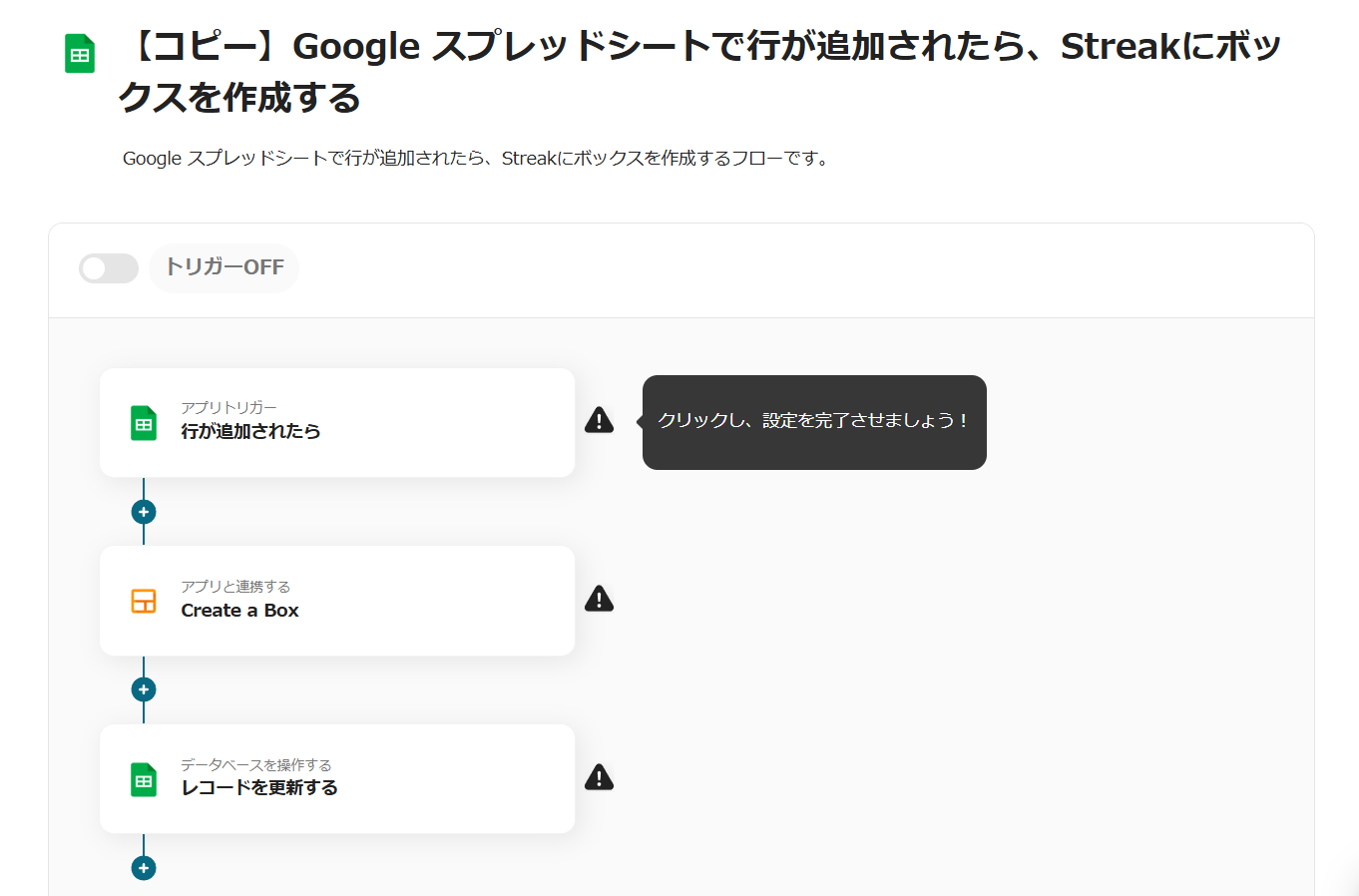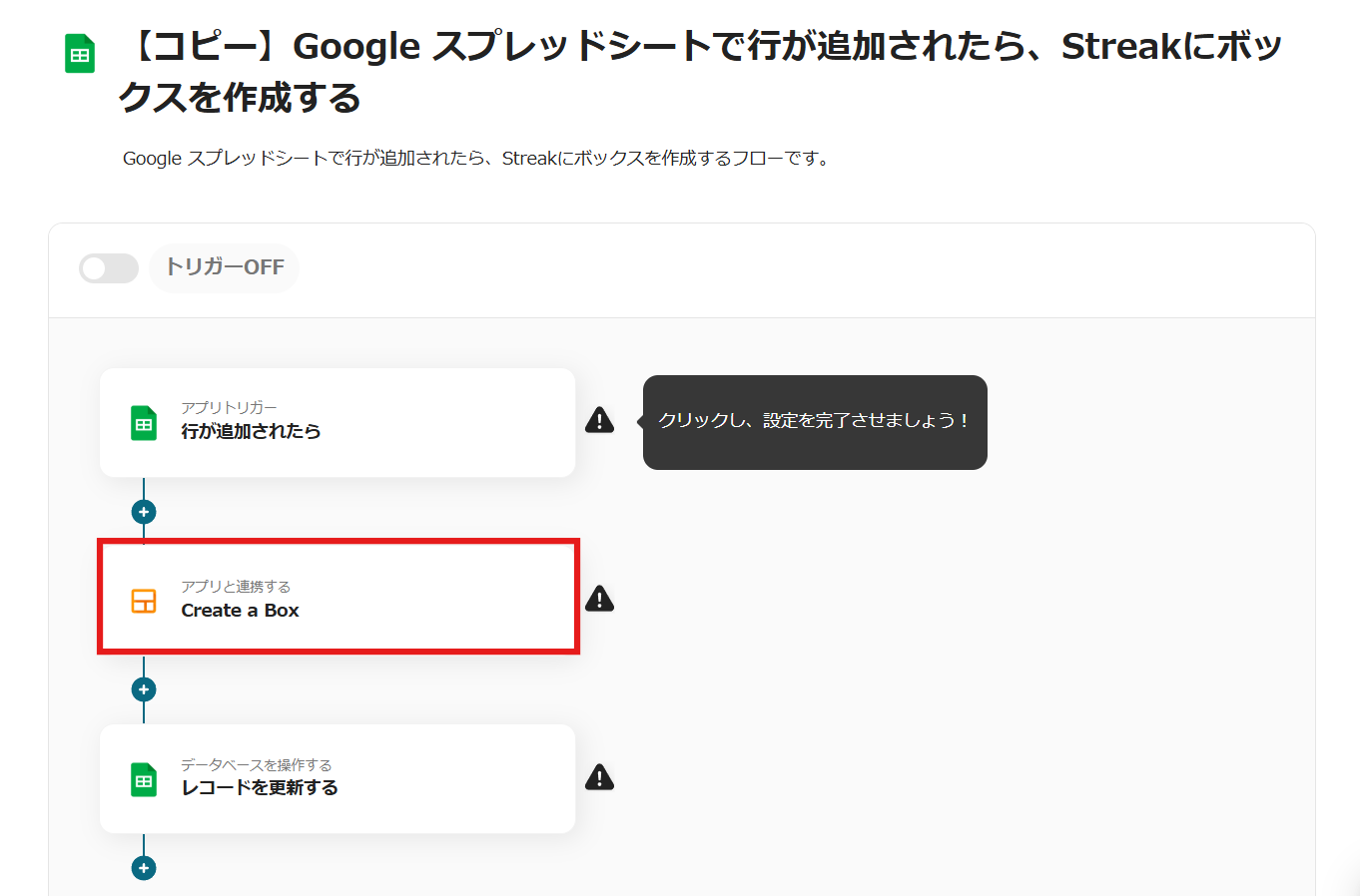 「【コピー】Google スプレッドシートで行が追加されたら、Streakにボックスを作成する」をクリックします。
