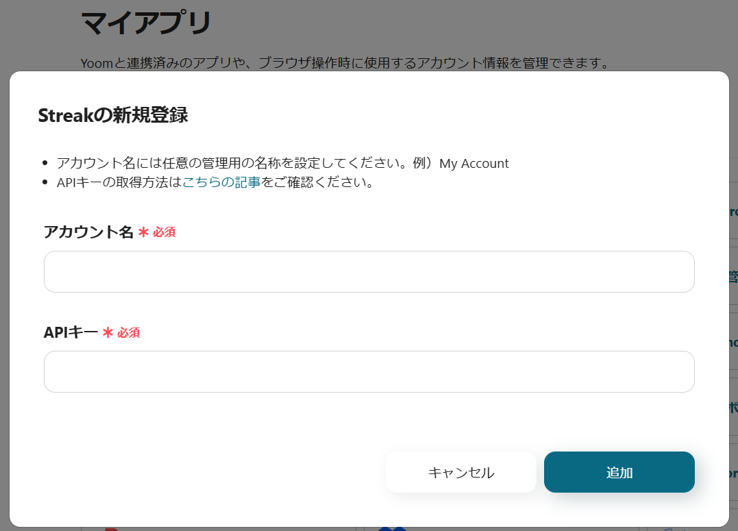 アカウント名は任意のもので構いません。社名や担当者名などのわかりやすいものがおすすめです。APIキーはStreakから取得しペーストします。APIキーの取得方法についてはこちらをご確認ください。