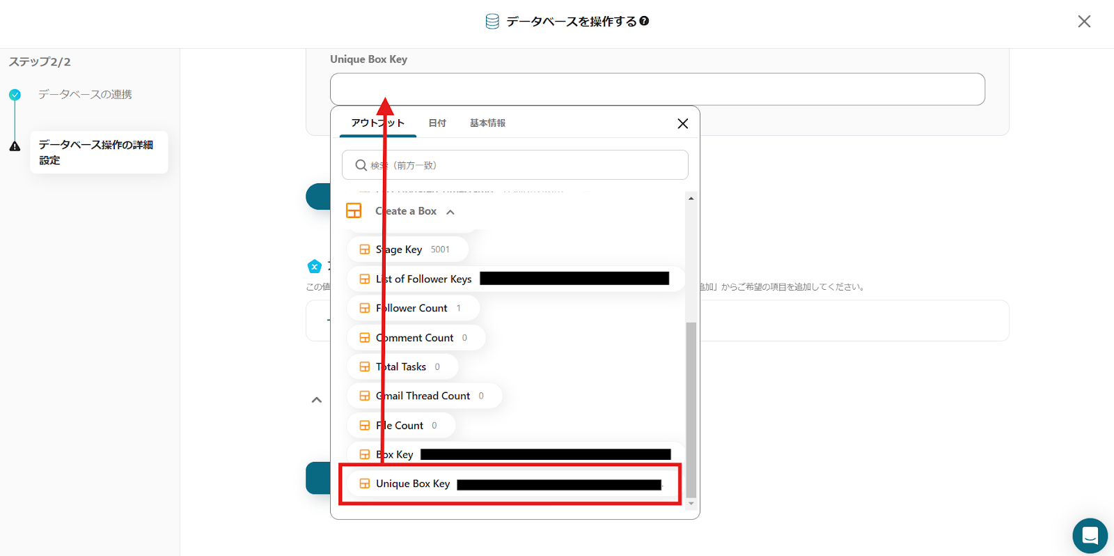 画像の場合、ボックスの項目名が「Unique Box Key」のため、Streakのデータからは同じく「Unique Box Key」を選びました。