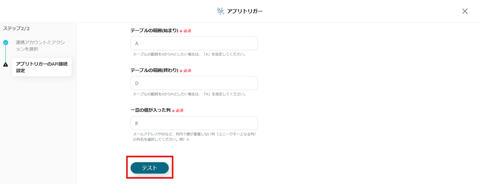 テーブル範囲に関しては用意したGoogle スプレッドシートに依存するため、Google スプレッドシートの内容に沿って入力していきましょう。
