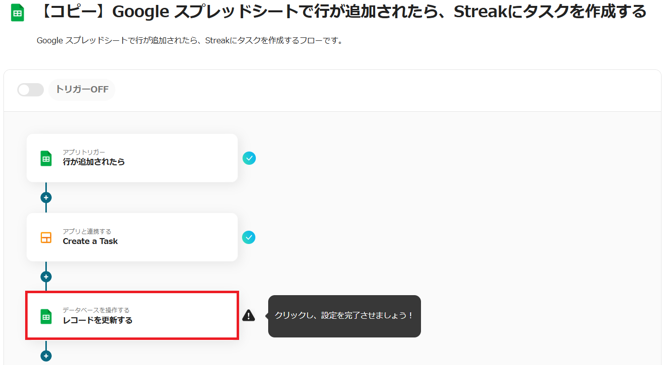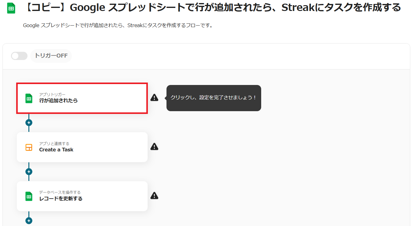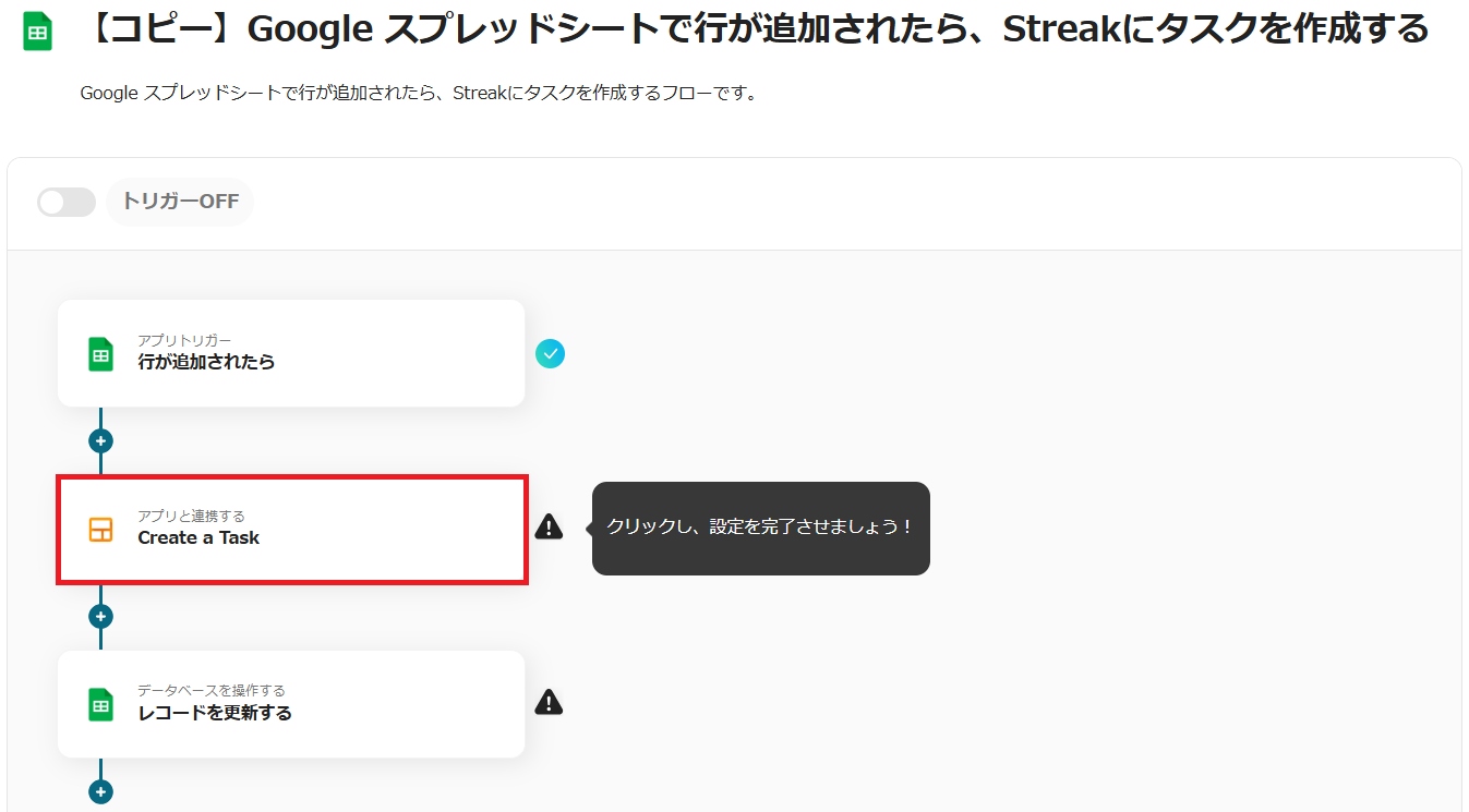 7.トリガーをONにすると、以降はGoogle スプレッドシートに行が追加されたら、自動でStreakにタスクが作成されます。