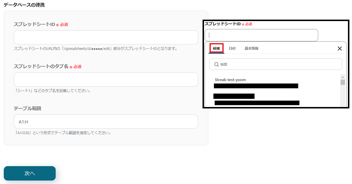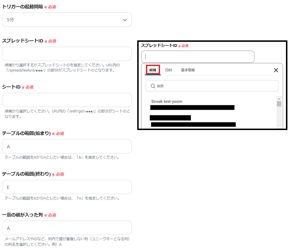 ※スプレッドシートID、スプレッドシートのタブ名は、枠をクリックして表示される「候補」から選択できます。