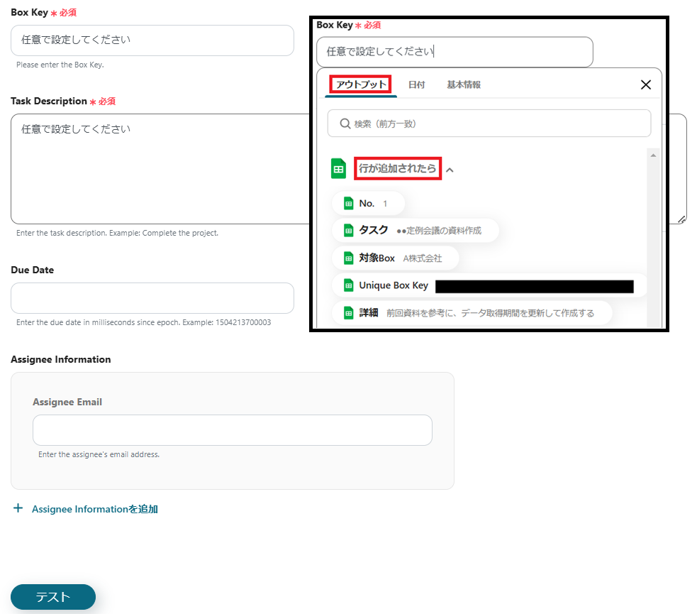 6.テストを行い成功すると、下記のように指定した枠にTask Keyが登録されます。