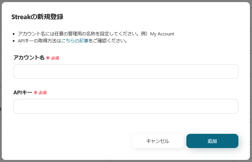 ・アカウント名、APIキーを入力し、「追加」をクリックすると、マイアプリに登録が完了します。