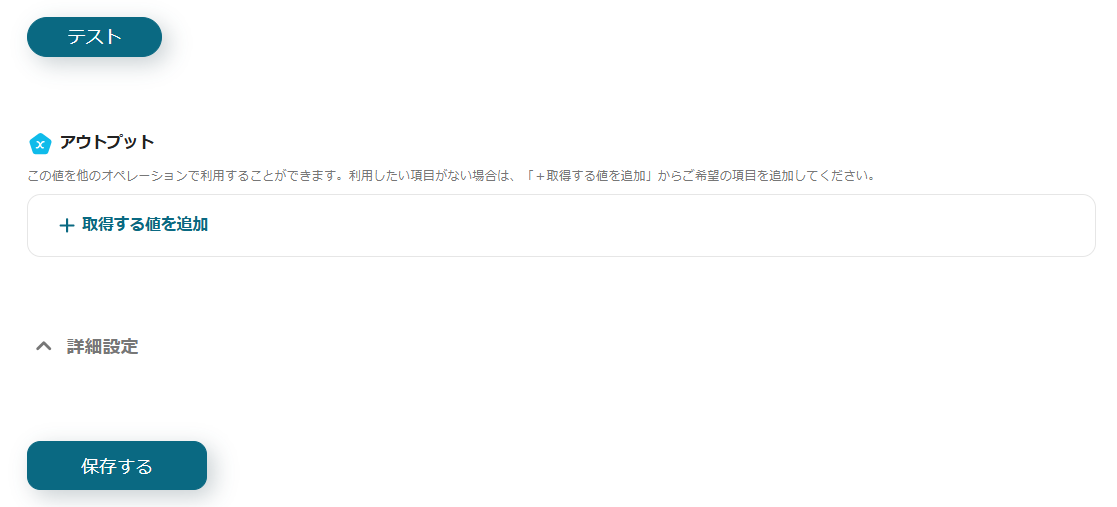 5.テストを行い成功すると、アウトプットにGoogle スプレッドシートから取得した情報が表示されます。問題がなければ保存します。