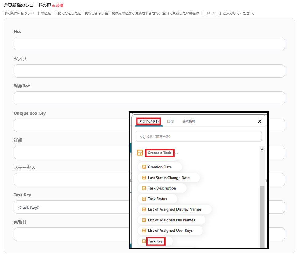 5.Task Keyを登録する枠に、アウトプットの「Create a Task」からTask Keyを設定します。(値は二重括弧で表示されます)