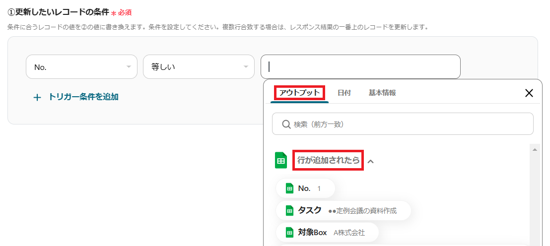 ※左枠には、指定したシートで一意の値が登録されている項目を設定します。右枠には、枠をクリックして表示されるアウトプットの「行が追加されたら」から対応する項目を設定します。(値は二重括弧で表示されます)