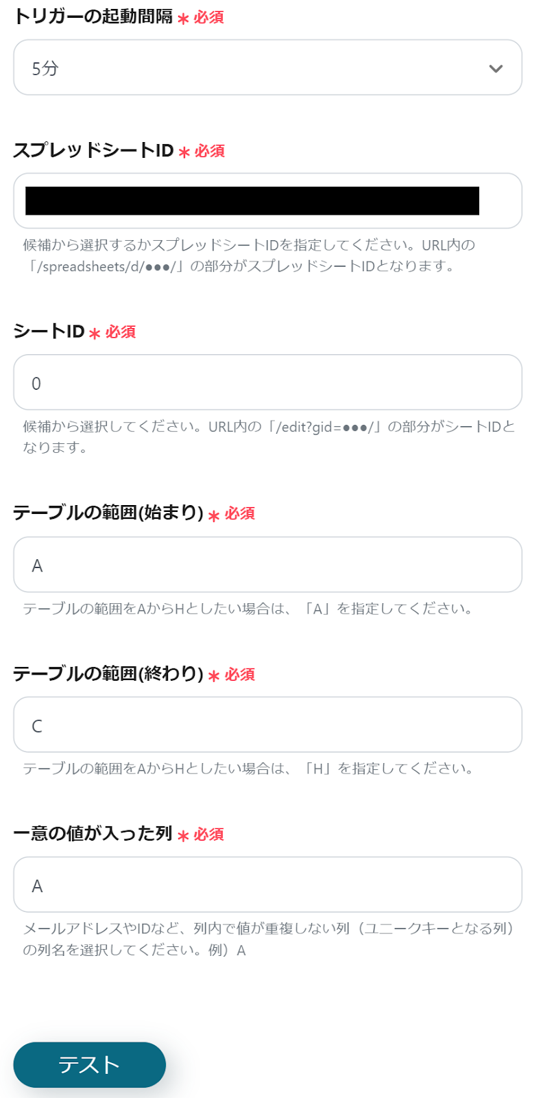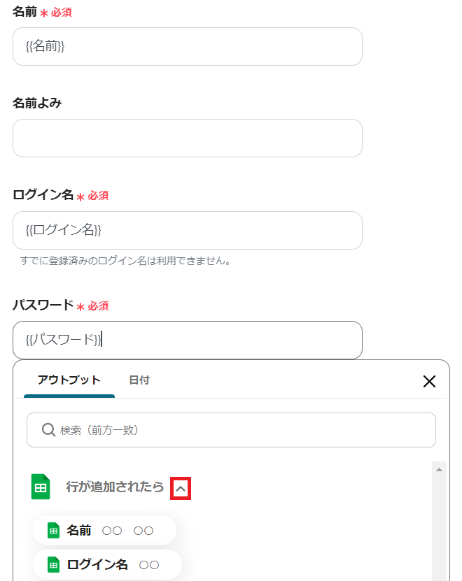 Googleスプレッドシートのアウトプットを利用して項目の設定を行います。