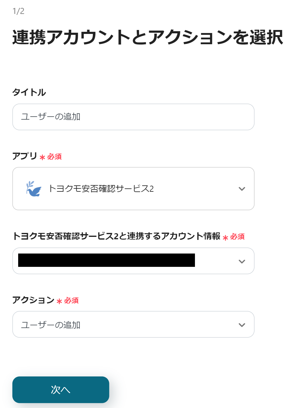 kintoneで登録された従業員情報をトヨクモ安否確認サービス2にも登録するフローです。