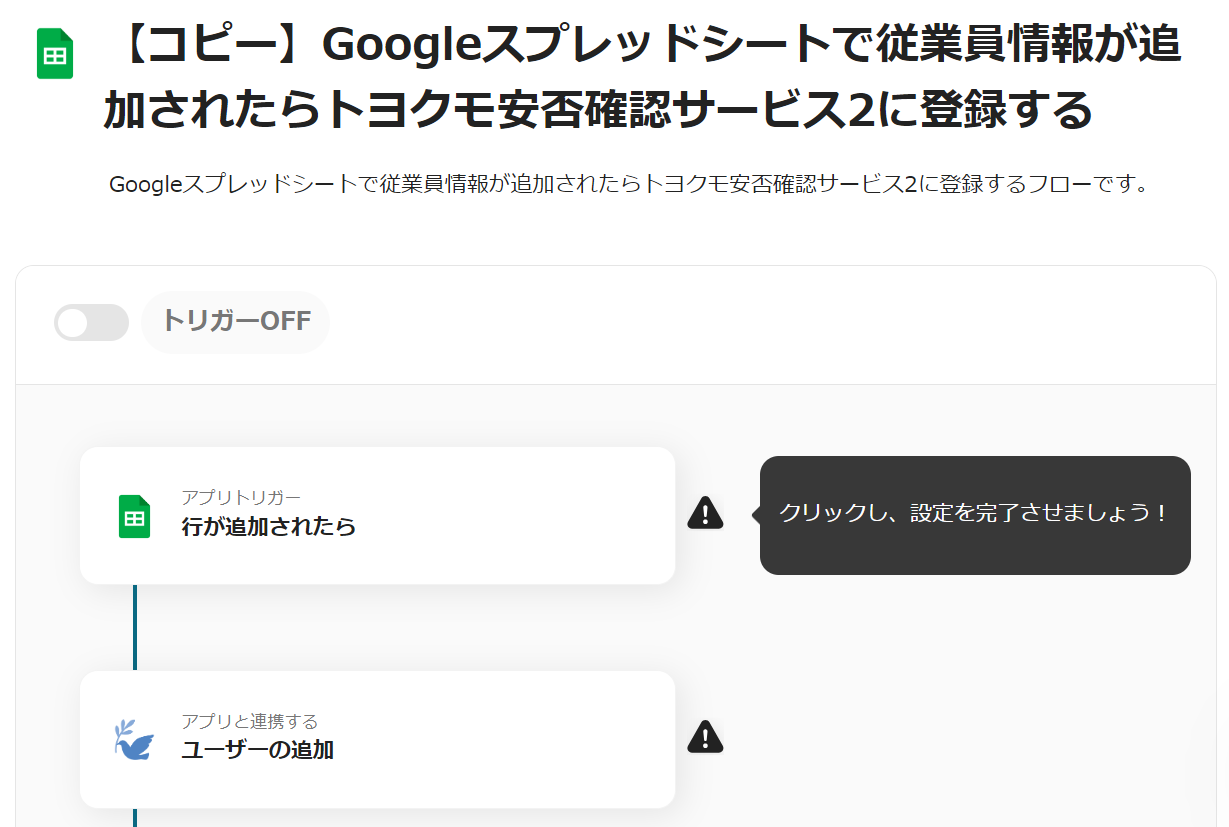 Googleスプレッドシートに新しい従業員情報が追加されると、その内容をもとにトヨクモ安否確認サービス2へ自動で登録するフローです。