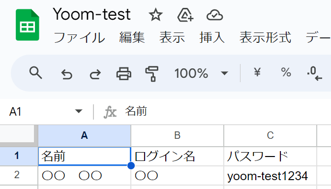 Googleスプレッドシートの画面に移動し、テスト用にユーザー情報を入力してください。