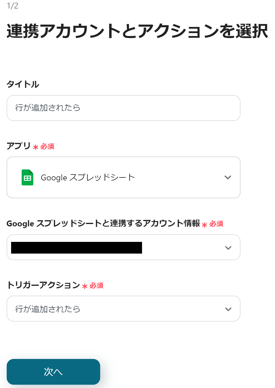 最初にGoogleスプレッドシートの設定から行うので、「行が追加されたら」をクリックしてください。