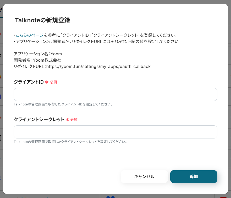 ・クライアントIDとクライアントシークレットを入力し、「追加」をクリックすると、マイアプリに登録が完了します。 ※クライアントIDとクライアントシークレットは、Talknoteのこちら のページから取得してください。