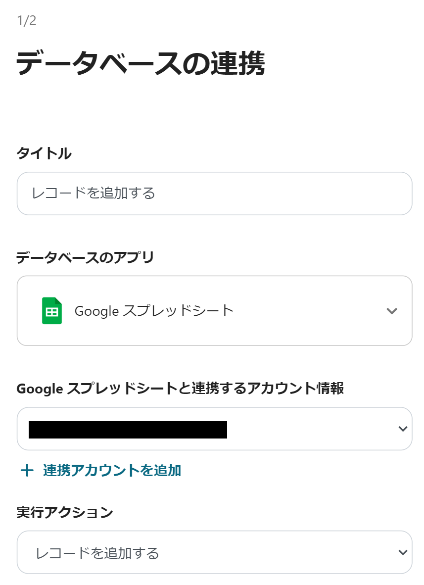 続いてGoogle スプレッドシートの設定を行うので、「レコードを追加する」をクリックします。 以下の画面が表示されたら、設定を確認しましょう。
