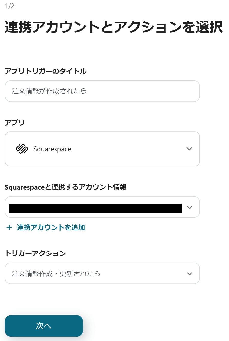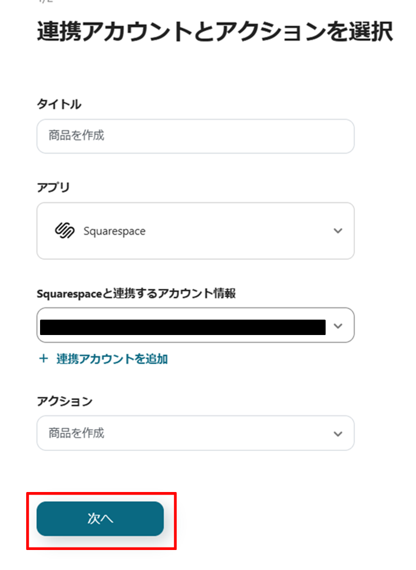 (2)Squarespaceの連携アカウントとアクションを選択画面より、Squarespaceと連携するアカウント情報に誤りがないかを確認し、アクションは「商品を作成」のままで、「次へ」をクリックします。