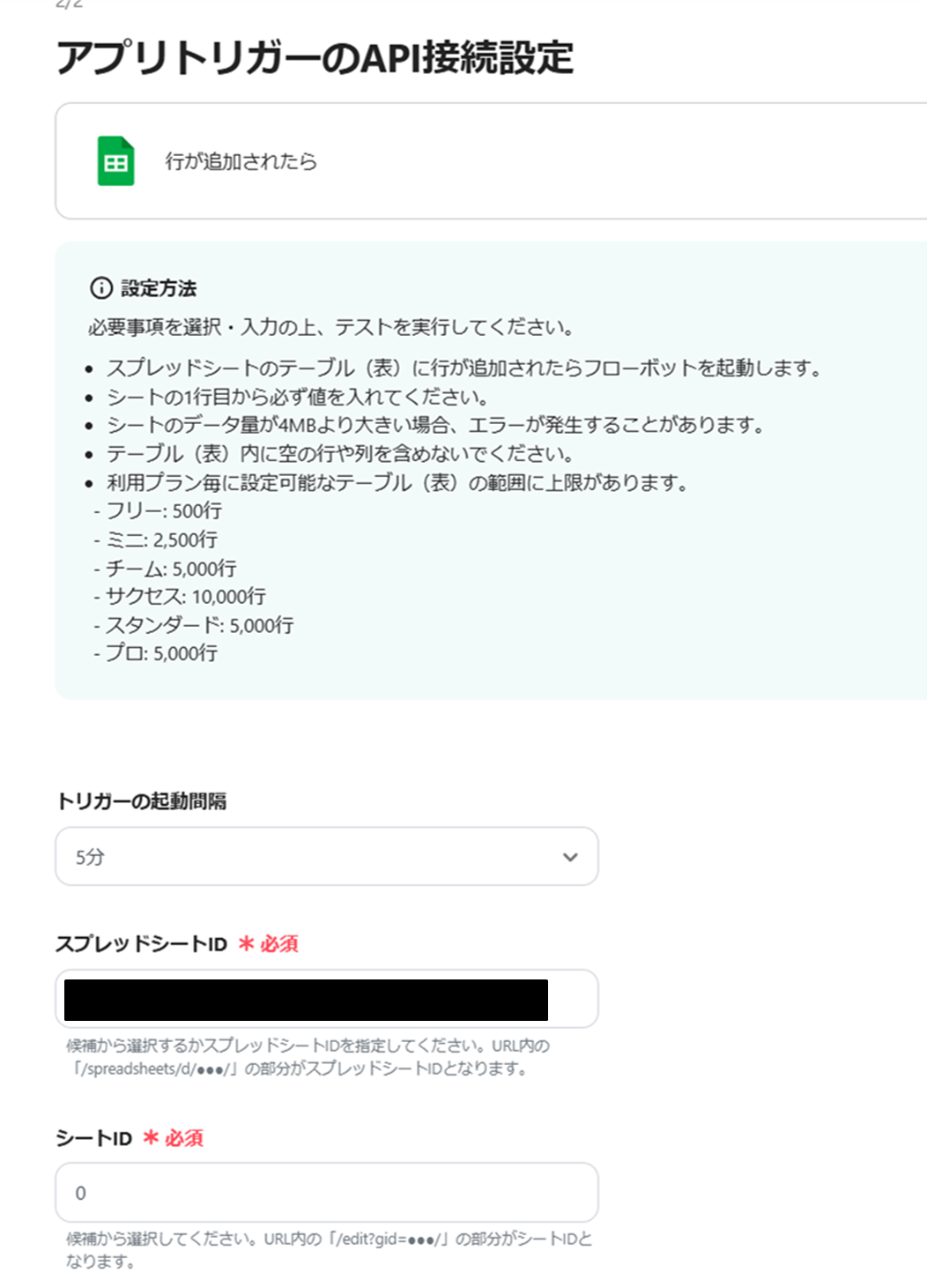(3)アプリトリガーのAPI接続設定画面より、トリガーの起動間隔、スプレッドシートID、シートIDを入力します。