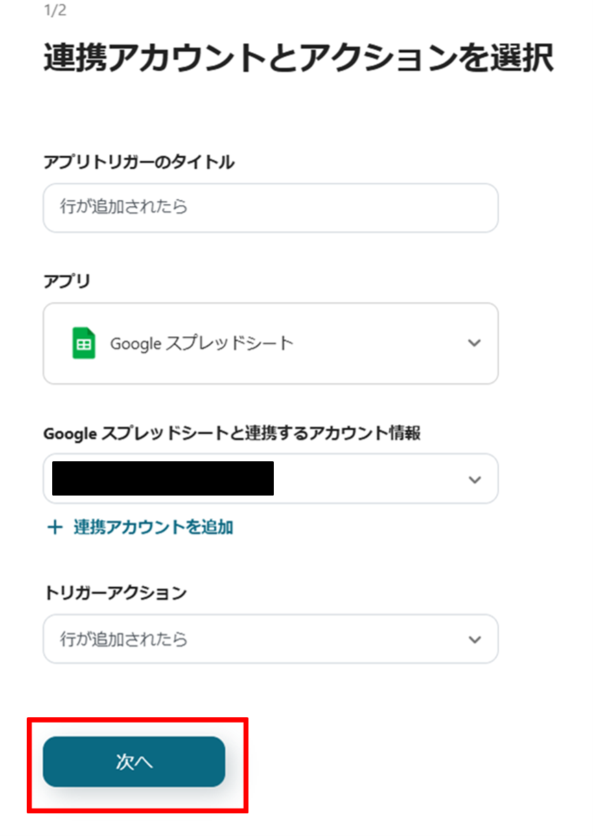 (2)連携アカウントとアクションを選択画面よりGoogle スプレッドシートと連携するアカウント情報に誤りがないかを確認し、トリガーアクションは「行が追加されたら」のままで「次へ」をクリックします。