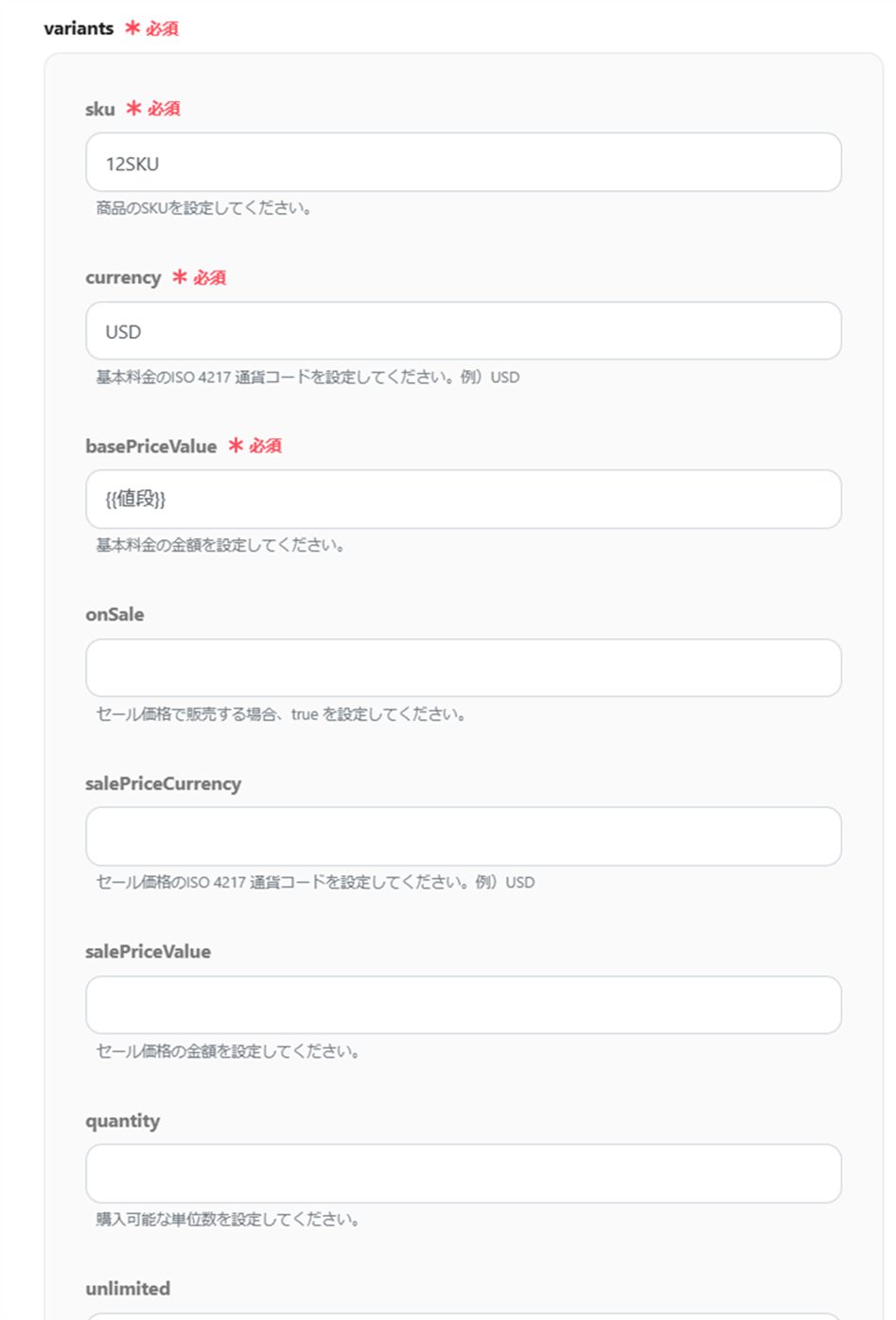 sku:商品のSKUを入力してください。 (SKUとは、受発注・在庫管理を行うときの、最小の管理単位をいいます。カラーが3色あり、例えばサイズがS・M・L・LLの4種類ある場合は「12SKU」です。)