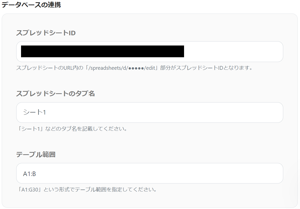 「スプレッドシートID」→スプレッドシートのURL内の「/spreadsheets/d/●●●●●/edit」の●部分がスプレッドシートID