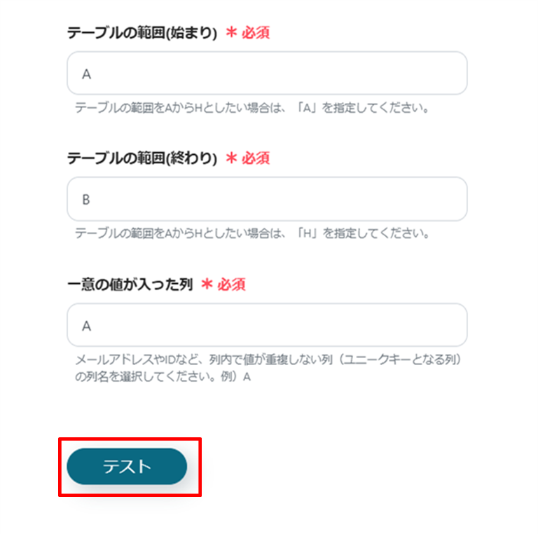 さらに下へ進み、テーブルの範囲(始まり)、テーブルの範囲(終わり)、一意の値が入った列を入力します。
