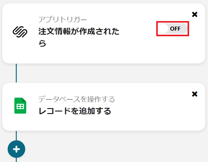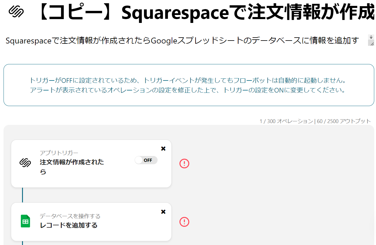 Squarespaceで注文情報が作成・更新されたらGoogle スプレッドシートのデータベースに情報を追加するフローです。