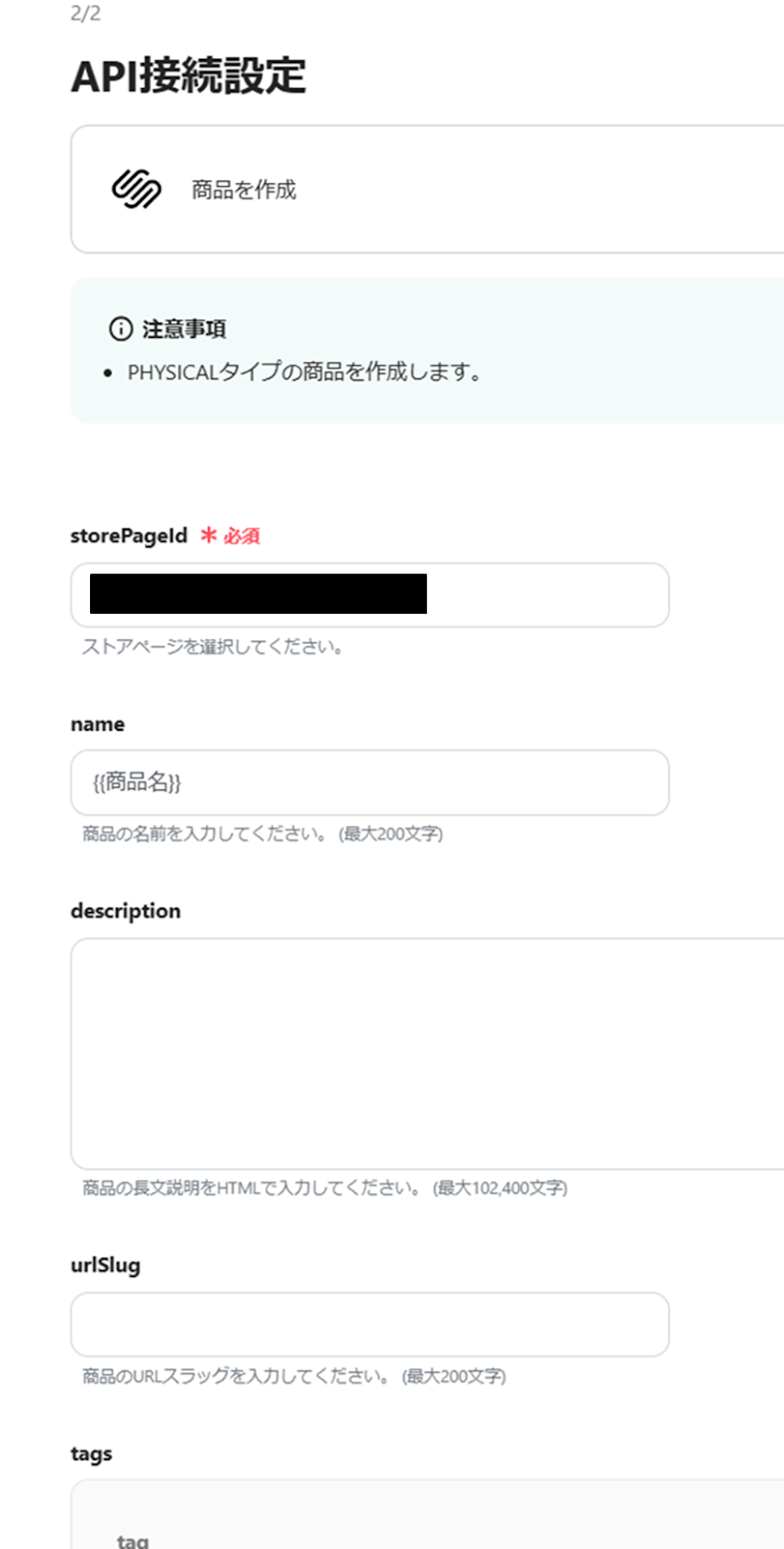 Squarespaceで商品を作成するアクションを設定する際に、商品を登録したいストアページのID(storePageId)を任意で設定してください