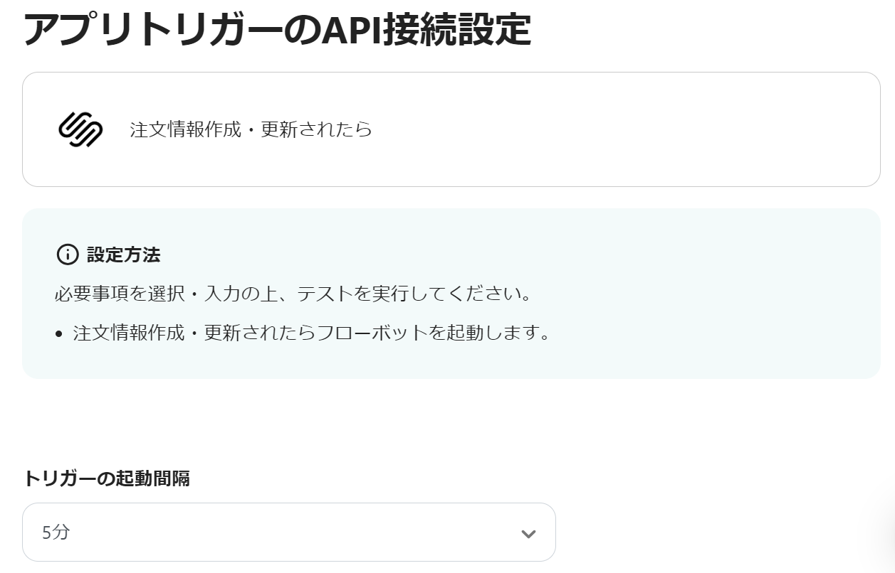 以下の画面が表示されるので、「トリガーの起動間隔」を任意で設定しましょう。 ここでも実際にSquarespaceで注文情報の作成・更新を行なってください。 その後フローに戻り、「テスト」→「テスト成功」となったら「保存」をクリックしてください。