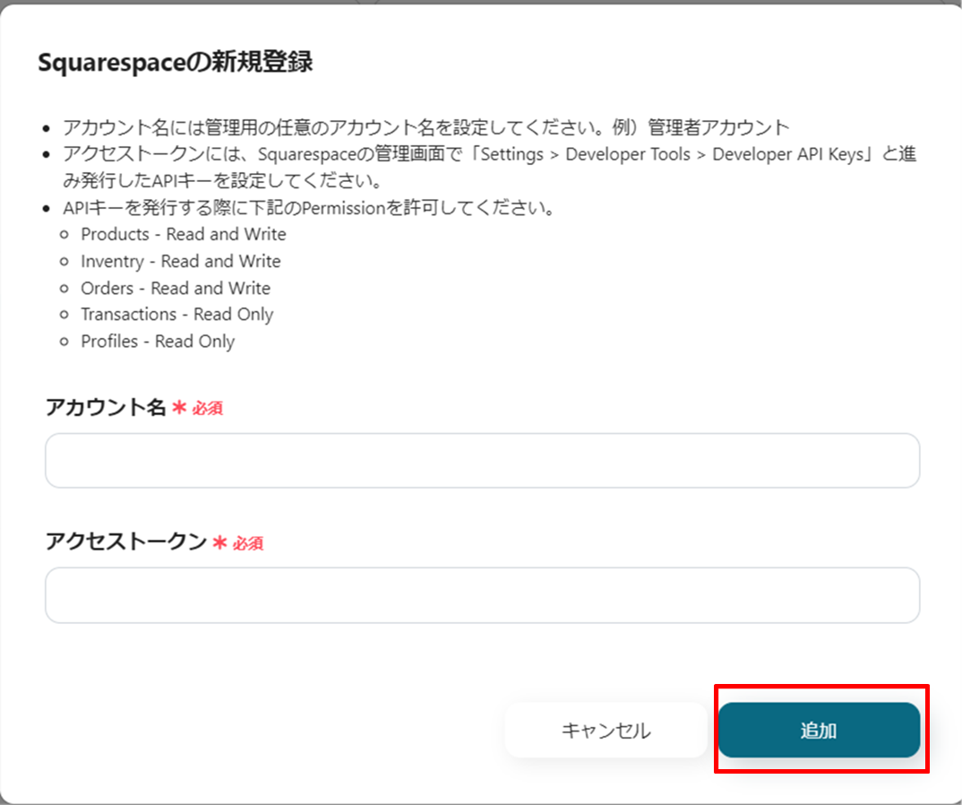(2)Squarespaceの新規登録画面より、アカウント名、アクセストークンを入力し、「追加」をクリックします。