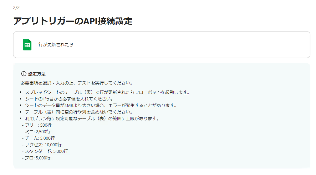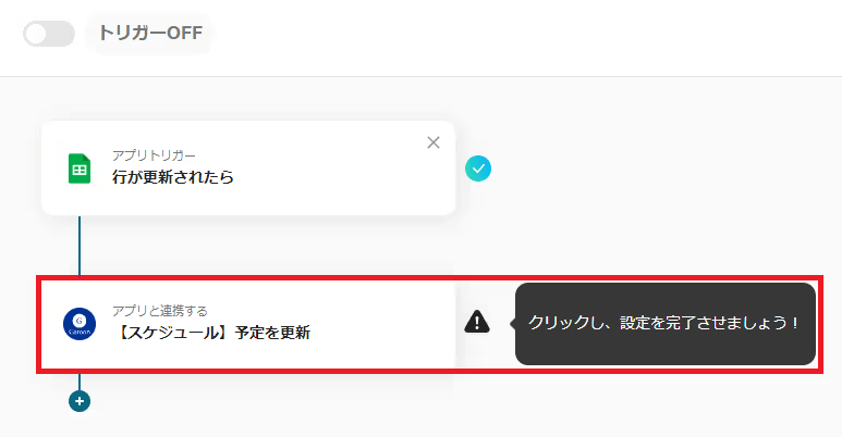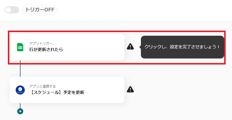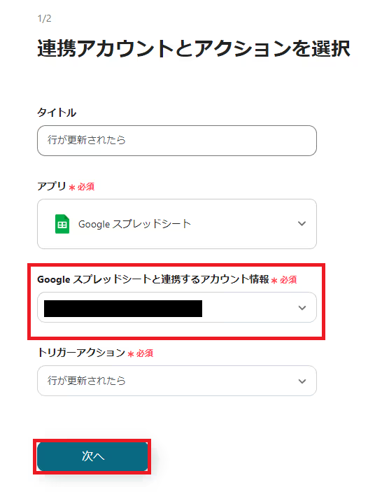 まずは「行が更新されたら」を選択して、設定の確認をしていきます。