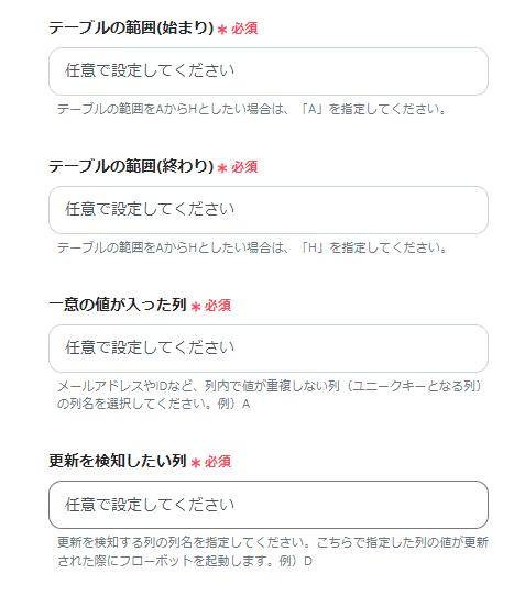 「更新を検知したい列」→更新を検知する列の列名を設定