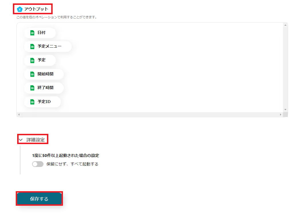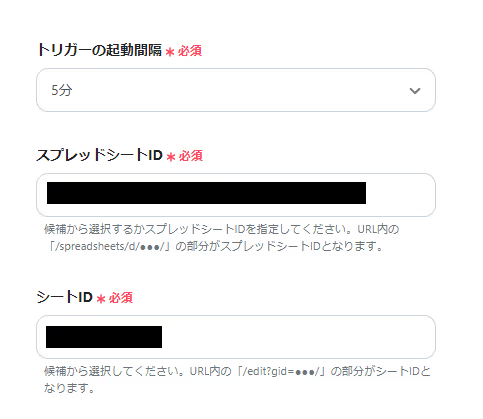 「スプレッドシートID」、「シートID」→候補から選択もしくは説明文を読んで入力