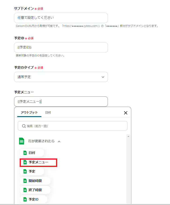 ここのアウトプット(取得した値)は、後述のGaroonの設定で使用できます。