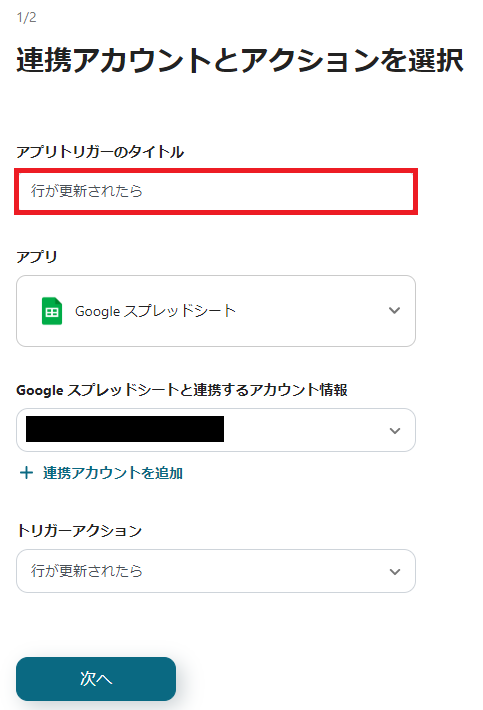 3.「連携アカウントとアクションを選択」の設定をします。 「アプリトリガーのタイトル」を必要に応じて変更し、「次へ」をクリックします。
