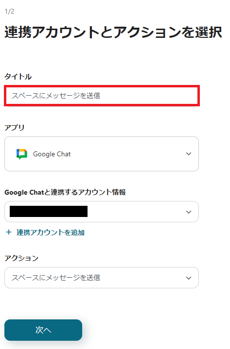 2.「連携アカウントとアクションを選択」の設定をします。 タイトルを必要に応じて変更し、「次へ」をクリックします。