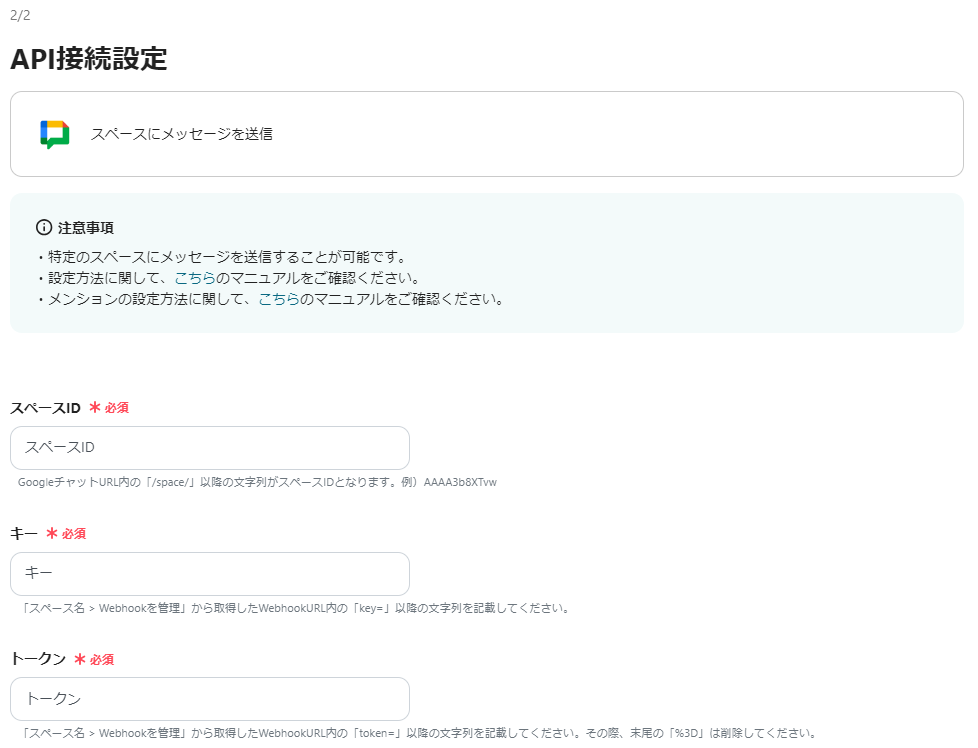 3.API接続設定をします。 スペースID、キー、トークン:欄下部の注記を参考に、任意の値を入力してください。 メッセージ内容:通知文の内容を入力してください。ステップ2で取得した値の参照が可能です。