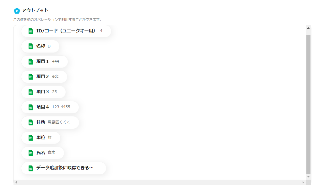 Googleスプレッドシートから抽出された項目がアウトプットに表示されています。