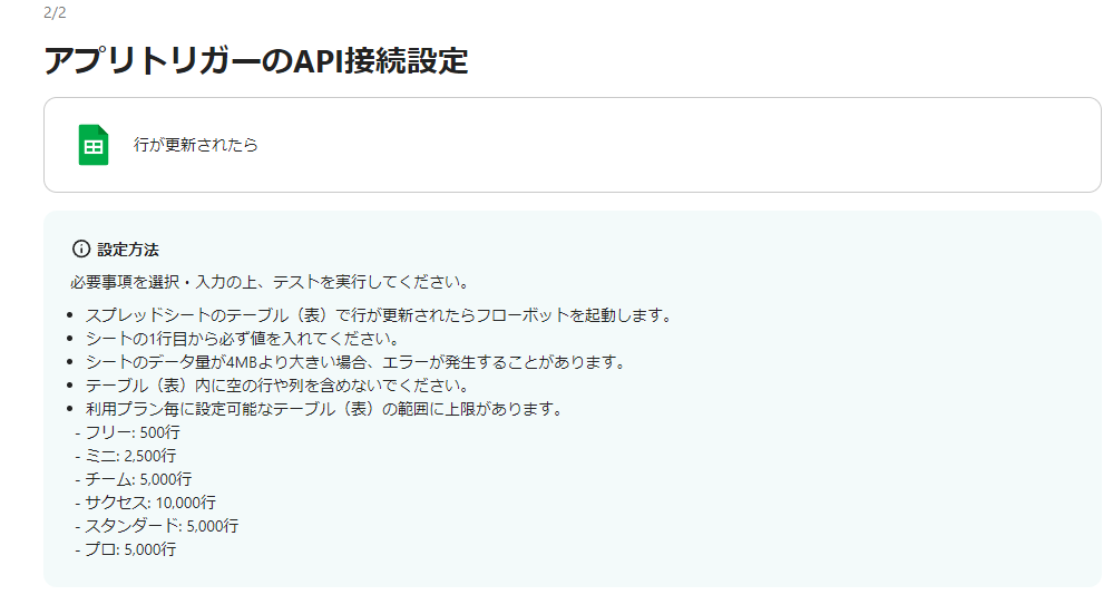 まずは「行が更新されたら」を選択して、設定の確認をしていきます。