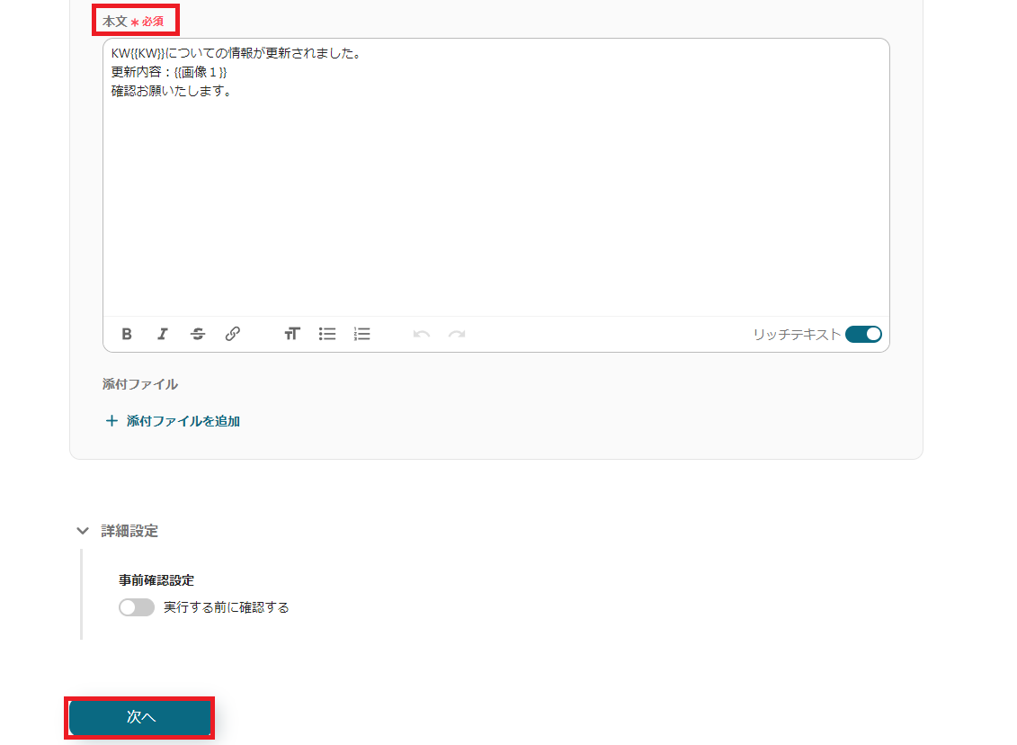 自動送信する際のメール本文も入力完了したら、「次へ」 を押しましょう。