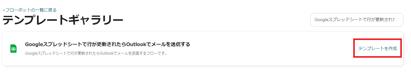 右上の検索窓に「Google スプレッドシートで行が更新されたらOutlookでメールを送信する」を入力して検索します。