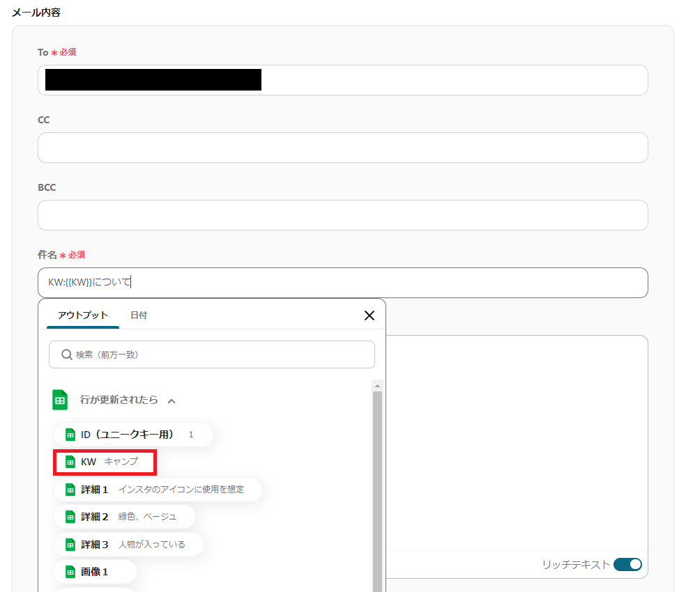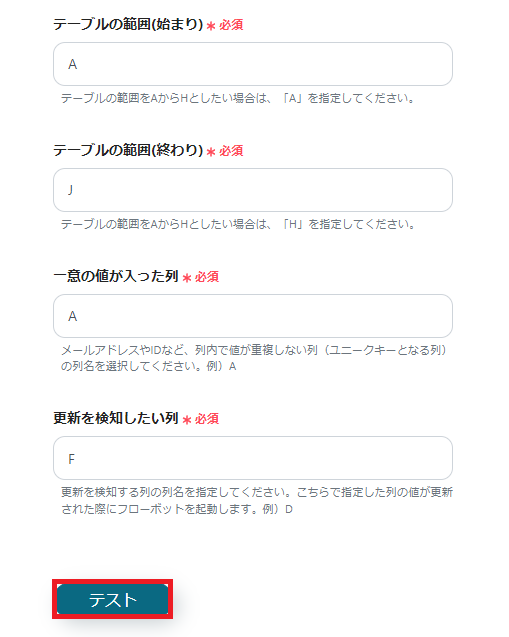 まずは「行が更新されたら」を選択して、設定の確認をしていきます。