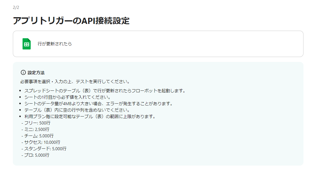 入力欄下部に補足があるので確認してください。 Google スプレッドシートIDはご自身のスプレッドシートを使用してください。 トリガーは5分、10分、15分、30分、60分の間隔で起動間隔を選択できます。(プランによって最短の起動間隔が異なります)