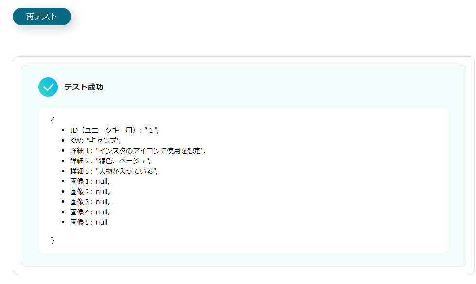 入力完了後、テストボタンで動作確認をすることができます。 成功すると下記のような画面になるので参考にしてみてください。