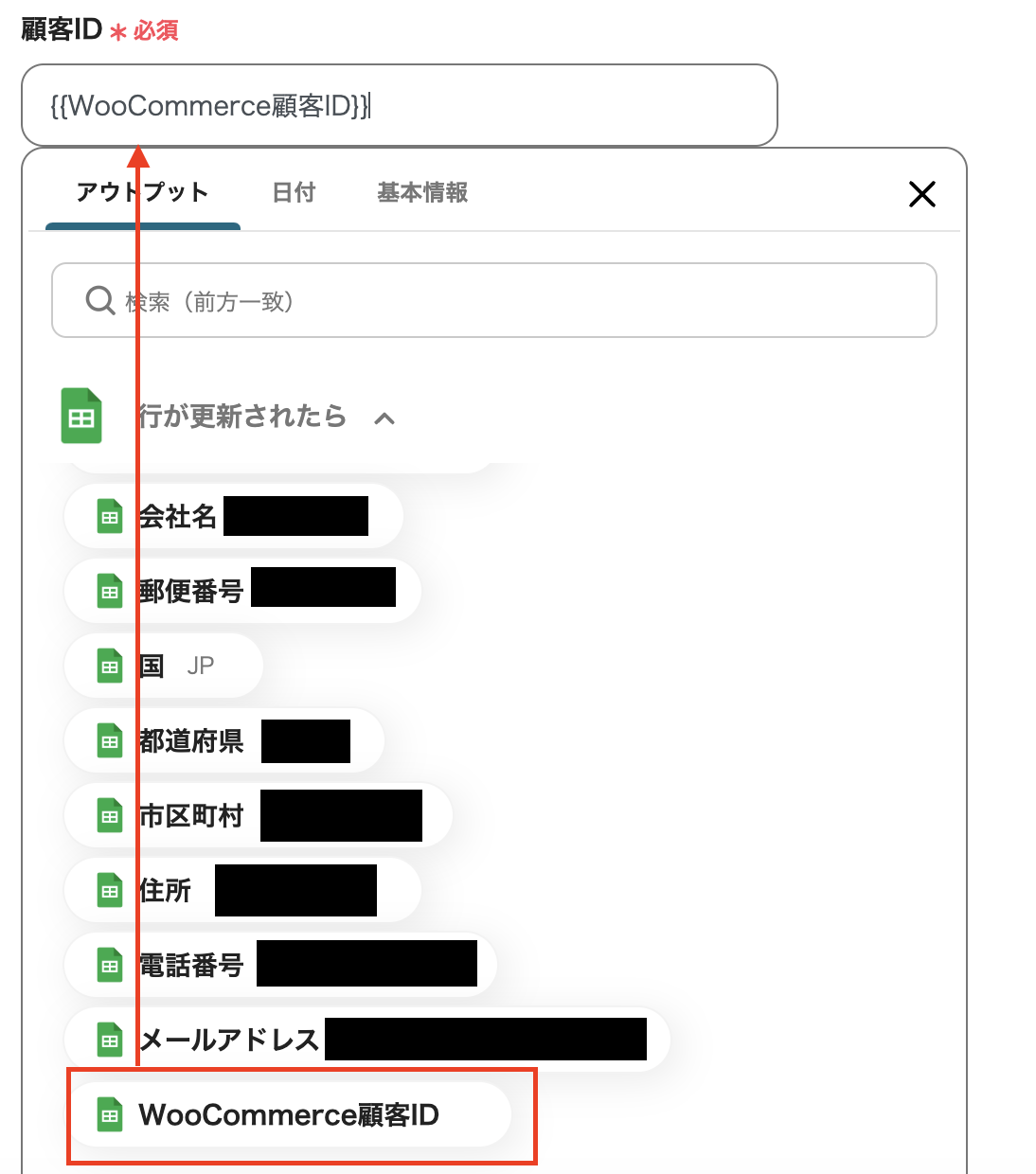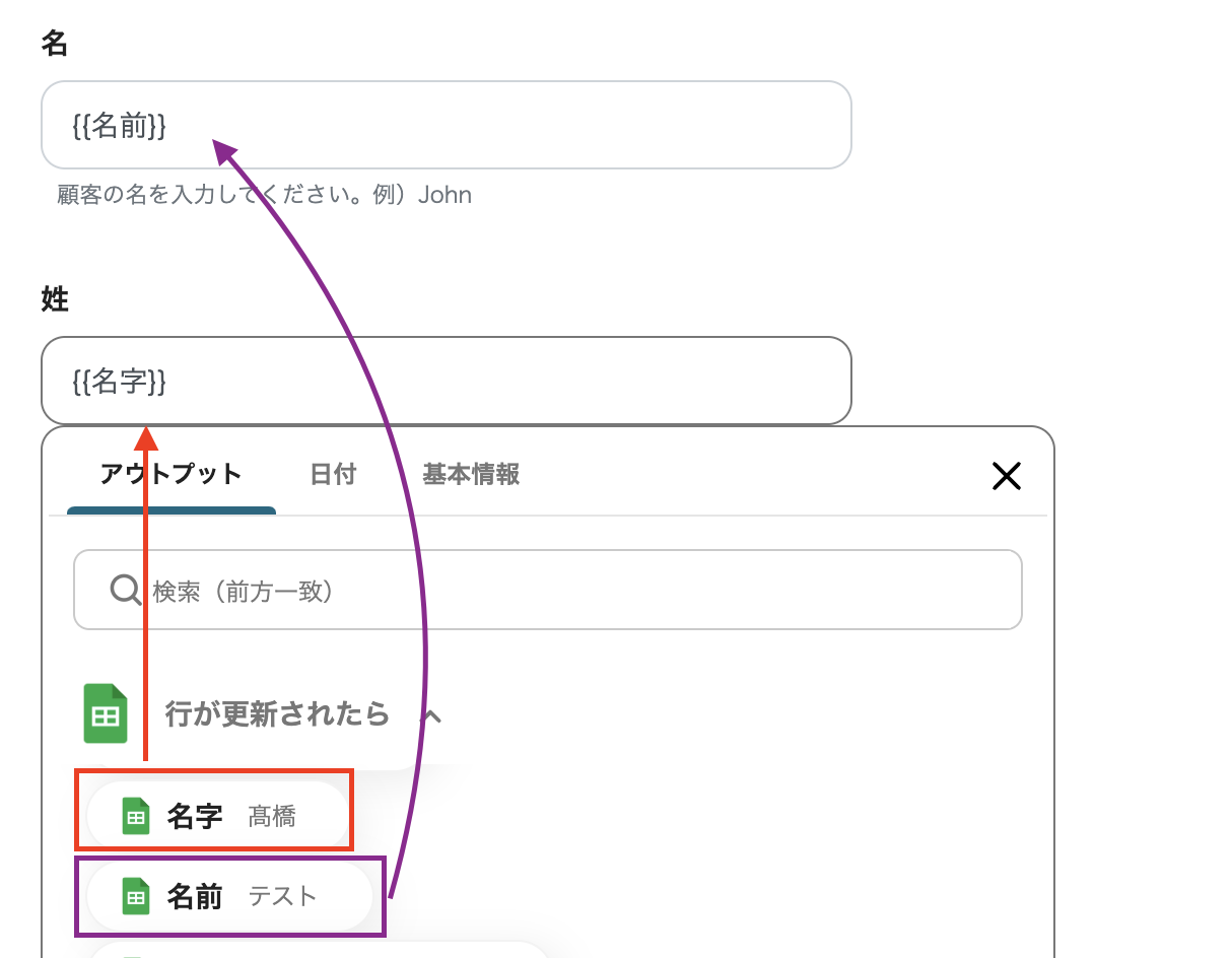 以下の画面は、例として前ステップから取得したアウトプット【顧客ID】と【メール】、【名】、【性】の情報を引用・設定したものです。