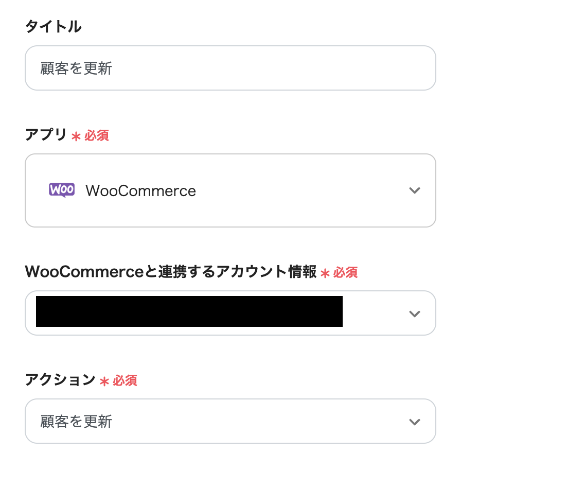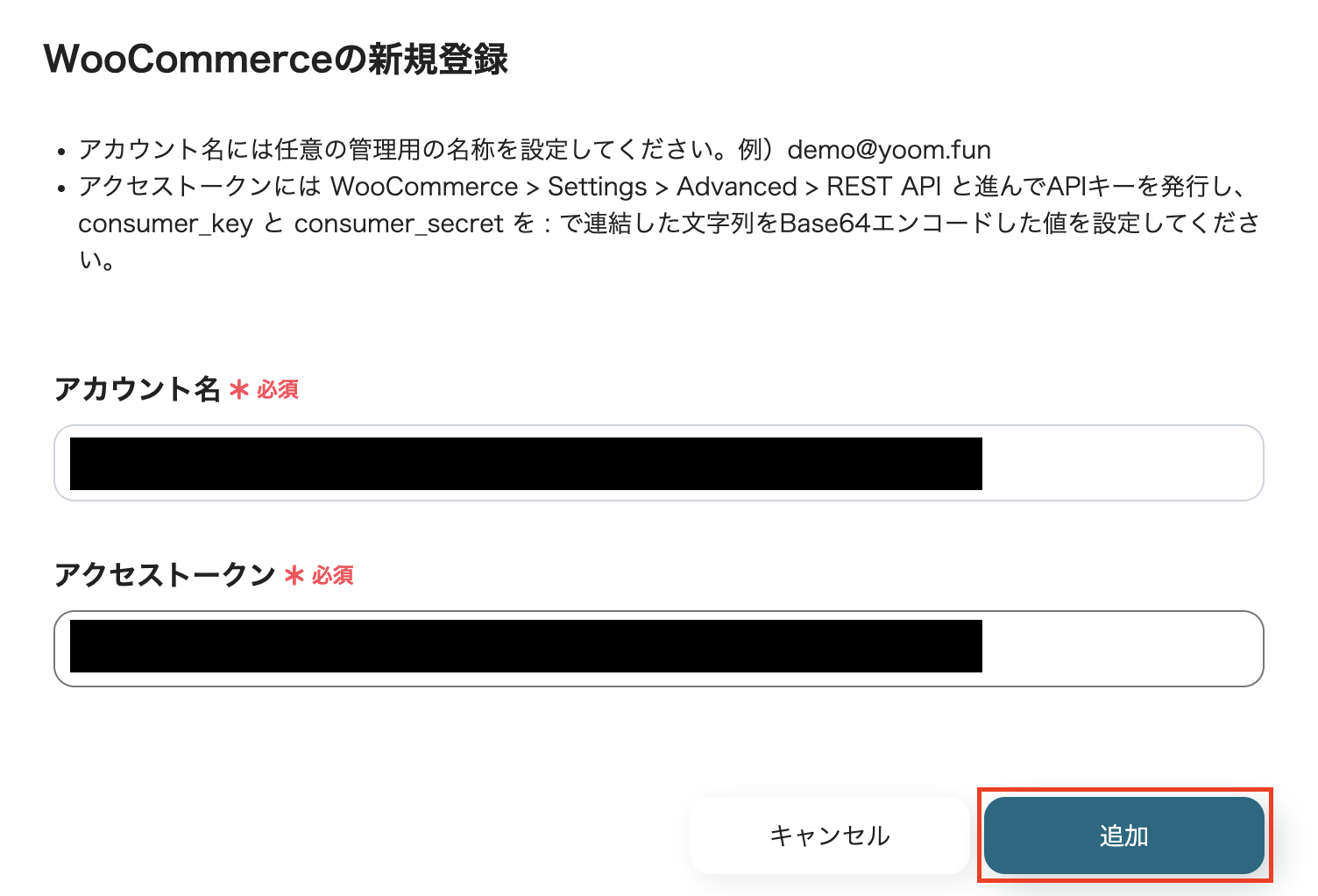 (4)連携させたいWooCommerceの「アカウント名」と「アクセストークン」を入力します。
