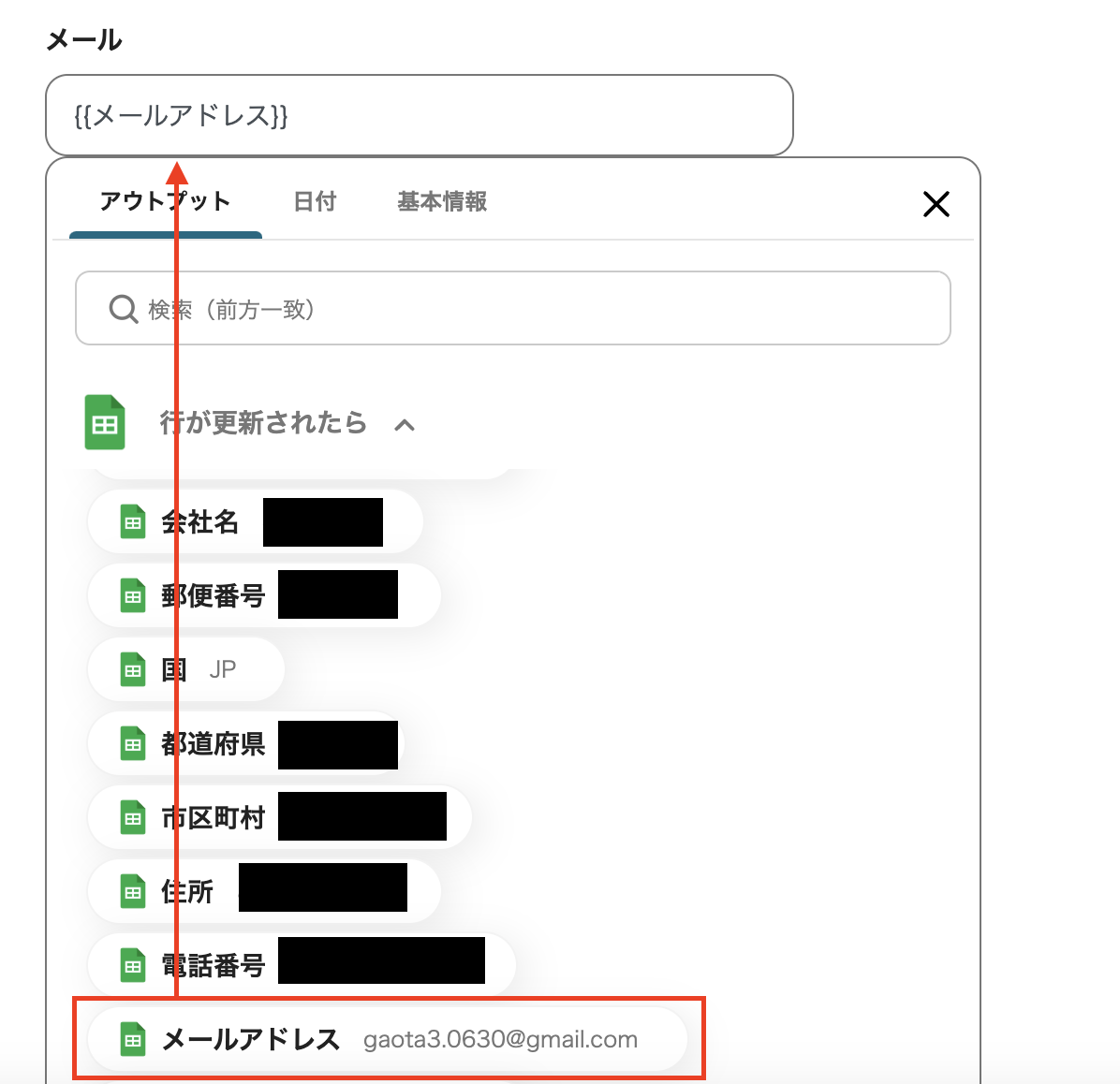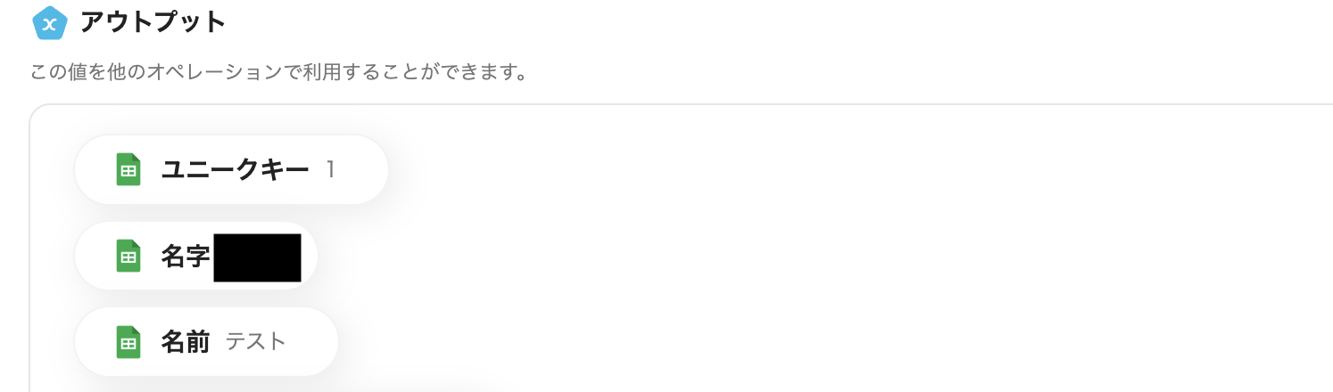アウトプット情報は、「この値を他のオペレーションで利用することができます。」という注釈の通り、この後のステップで引用・活用できます。
