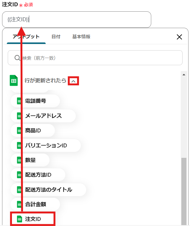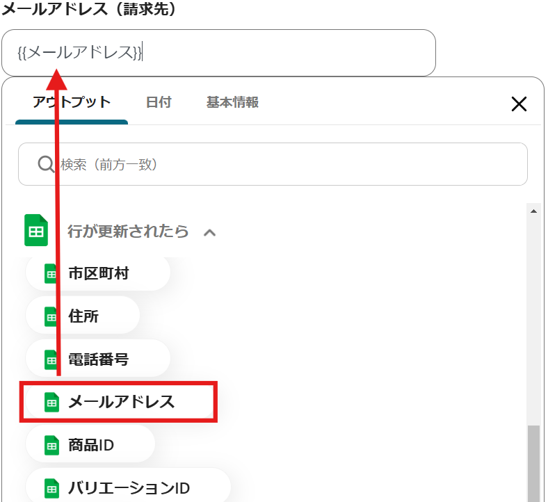 今回はメールアドレスを更新する設定を行うので、Google スプレッドシートのアウトプットからメールアドレスを選択します。