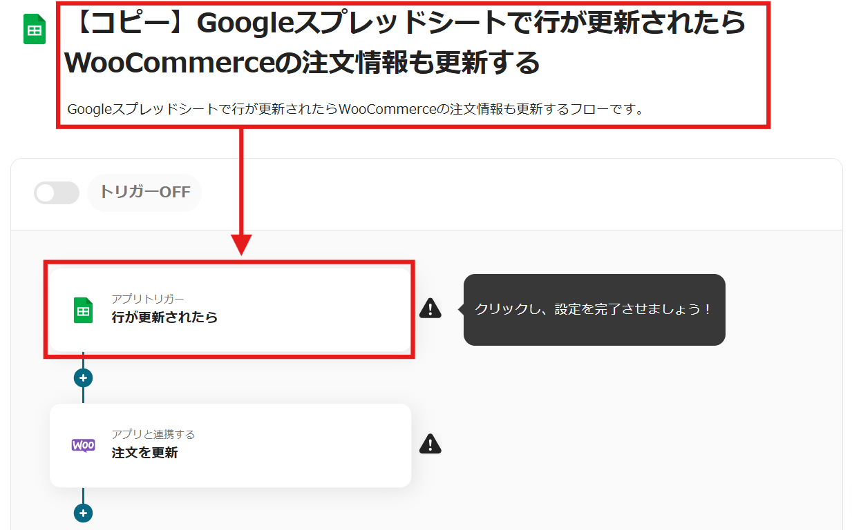 今回は「Google スプレッドシートで行が更新されたらWooCommerceの注文情報も更新する」という以下のテンプレートの設定方法をご紹介します。