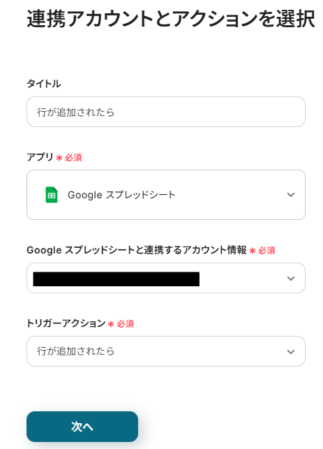「タイトル」→自由に変更可能 「アプリ」→Google スプレッドシート 「Google スプレッドシートと連携するアカウント情報」→アカウントに相違がないか確認 「トリガーアクション」→行が追加されたら